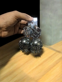 Step into the world of understated luxury with the Elegant Oxidized Silver Mirror Jhumka Earrings, exclusively from Silvana. These earrings are the perfect blend of traditional artistry and modern elegance. Whether you're dressing up for a festive celebration or adding a touch of sophistication to your everyday look, these jhumkas are designed to make heads turn.